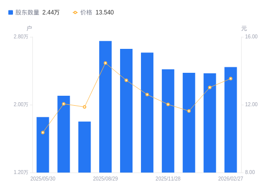 日期A股户数(户)流通A股户均持股数(股)户均持股市值(万元)2026-02-27244399595.5212.992026-01-30237119890.1312.882025-12-31237659867.6611.482025-11-28241749700.7111.662025-10-31261428970.4311.302025-09-30265828821.9511.862025-08-29275188521.8712.322025-07-311800913021.5415.462025-06-302105411138.2613.422025-05-301854212643.7713.10